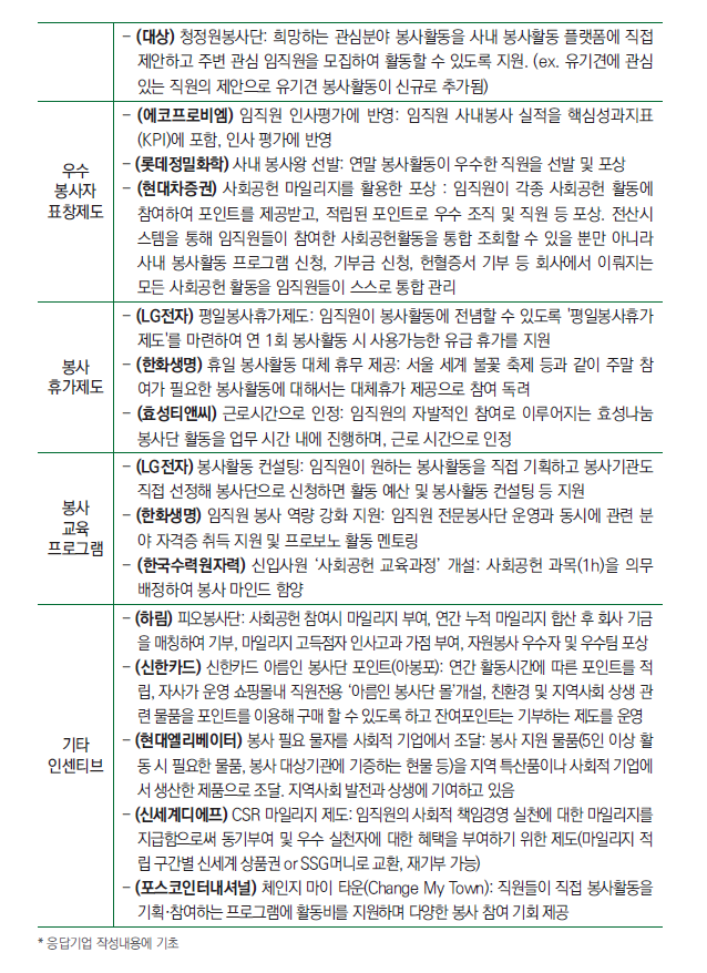 임직원 봉사활동은 팬데믹을 거치며 위축되었던 현장 참여가 재개·확대되는 흐름과 함께, 비대면·디지털 방식의 봉사 병행이 동시에 나타납니다. 본 보고서에서는 기업들이 임직원 참여 제도를 고도화하고, 사회공헌 프로그램과 연동된 교육·멘토링·환경 활동 등 직무·전문성과 연결된 봉사 포트폴리오를 확대하는 경향을 소개합니다. 또한 일부 사례에서는 사내 제도(봉사 휴가제도, 우수봉사자 등록제도, 봉사 교육프로그램 제공 등)를 통해 참여의 장벽을 낮추고, 지역·교육·환경 영역에서 지속 운영 가능한 모델을 만드는 시도가 관찰됩니다. 보고서 전반의 사례들은 임직원 봉사가 단발성 이벤트가 아니라 기업의 사회적 가치 전략과 결합된 상시 플랫폼으로 전환되고 있음을 보여줍니다.