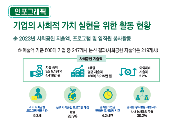 2023년은 국내 기업의 사회공헌과 ESG가 ‘사업 연계·협업·데이터 기반 관리’로 심화된 시점입니다. 보고서는 경기 불확실성 속에서도 기업이 지출 구조를 유지·개선하고, 아동·청소년·지역사회 등 핵심 대상과 환경·안전 투자 확대로 사회적 가치를 높여가는 흐름을 정량 데이터로 확인합니다.