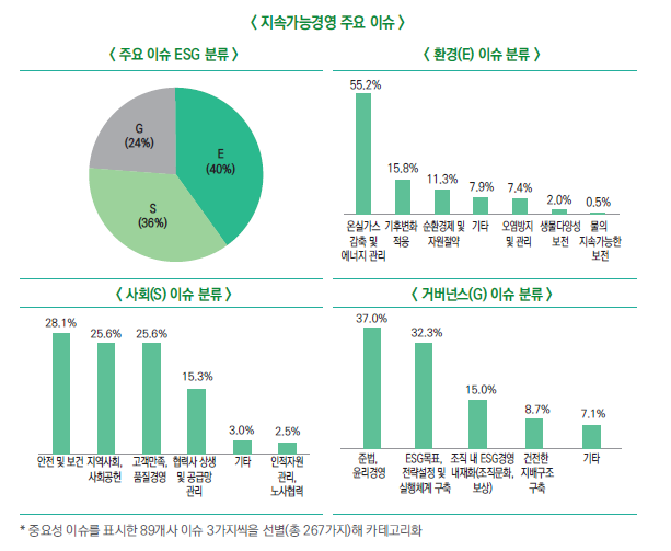 기업들이 중요하게 생각하는 지속가능경영 이슈 중 가장 많은 비중을 차지한 것은 환경(E: 107건, 40.2%)으로 나타나며, 이어 사회(S: 95건, 36.0%), 거버넌스(G: 65건, 23.8%) 순으로 조사됩니다. 특히 기업들은 환경(E)에서는 ‘온실가스 감축 및 에너지 관리’, 사회(S)에서는 ‘안전·보건’, 거버넌스(G)에서는 ‘준법·윤리경영'을 최우선 과제로 두고 이를 중요한 세부 이슈로 관리합니다.
