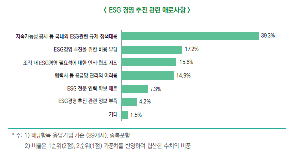 보고서에 따르면 온실가스 배출 공시는 500대 기업의 약 절반(236개사, 47.2%) 수준이며, Scope 3 공시 기업 수는 2021년 101개 → 2022년 127개 → 2023년 155개로 증가했습니다. 에너지 사용량 대비 재생에너지 사용 비율은 2021년 3.4%, 2022년 6.0%, 2023년 6.3%로 상승했고, 환경·안전 투자액은 전년 대비 113.7% 증가했다고 제시됩니다. 추진 애로요인으로는 ‘지속가능공시 등 국내외 ESG 규제나 정책 대응’이 39.3%로 가장 큰 부담으로 파악되며, 그 외 인력·예산, 공급망 관리, 데이터 관리 등의 어려움이 함께 언급됩니다. 이러한 지표들은 기업들이 공시·데이터 관리와 함께 기후·안전 영역에 실질 투자를 확대하며,ESG를 운영 전반에 내재화하는 단계로 이동하고 있음을 보여줍니다.